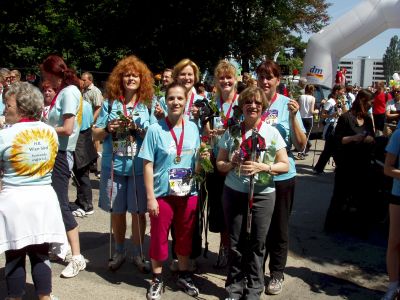 Ons het begin met ´n goeddeurdagte voorbereidingsprogram. Ons het ons laat informeer. Toe stokke gekoop. En goeie skoene. En ander kleertjies sodat ons beter kan lyk. Toe twee maal geoefen. Op 11 Junie aangemeld en ons nommers op onse voorkante gespeld. Tydmeters aan ons skoenrieme vasgewoel. Ons arms en bene gerek, gestrek, verskeie kante toe geknak en gekraak, asemhalingsoefeninge gedoen, ons mae ingetrek en les bes die stokke gepoets en getoets. Dis toe dat Nadia van haar laat hoor het: "Moes ek stokke gebring het?" Geoefen in probleemversorgingstegnieke na soveel jare in Die Vreemde besluit ons op die plek dat sy mos ook sommer sonder stokke kan loop. Die organiseerders het dit gelukkig ook so ingesien en streng bygevoeg dat sy maar kan deelneem maar sy moet weet as sy wen word sy gediskwalifiseer. Ons het Nadia net daar laat afsien van haar ideaal om tog eenmaal op´n internasionale podium te staan en spoggerig lyk en daar was ons span toe volledig. Nog nooit het een van ons aan so´n hottentotsgotparade deel gehad nie. Nog nooit was een van ons in´n wedloop saam met duisend ander vroue met swaaiende stokke nie. En toe die skoot klap skarrel daar twee duisend voete en tweeduisend stokke onder die bome van die Weense woud deur in die rigting van die wenpaal - 5 kilometer verder! Met ons voete, bene, stokke, arms en koppe eindelik onder beheer, soek ons skielik na Marie-Louise en Lizelle en merk verlig die twee wippende blonde kuiwe doer vorentoe besig om almal wat in hulle pad kom te systap. Ons ander pas vir Nadia op want ons wil nie hê dat sy gediskwalifiseer moet word nie ... So in die loop groet ons die mede-susters van Wien-Süd gemeente. Een van hulle deelnemers´n volle 80 jaar oud! Vasbeslote is ons na dié ontdekking - beslis gaan nie een van ons laaste aanmeld nie. Maar ons het mos ook goeie maniere. Hoe sal die inheemses nou voel as ons hulle te ver wen? Dus praat ons oor die weer, drink water langs die pad, gaan die wandelaars verby, slaat bietjie rem aan as ons bekommerd raak dat ons te ver voor is en versnel maar weer as ons deur die draaie is. Ons maal met die stokke dat die teerklippers spat en begroet elke kilometerbordjie met groeiende selfvertroue. Alles met´n plesierige glimlag. Ons kry so´n ekstra versnellinkie as ons reken daar´s ´n bekende gesig in die skare. Uitgelate word hande geklap en aangemoedig en fluitjies geblaas en oor die mikrofone word seker gemaak dat geen stapper se selfbeeld geknou raak deur die ervaring nie. Die uiteinde? Van die byna twintig stappers van onder die Erlöserkirche se dak, wen ons twee witkoppies toe by verre en eindig net so bietjie oor die tweehonderdste van voor af. Ons ander was so iets in die seshonderd en soveelste - nie van agter af nie. By die wenpaal is elke dapper stapper vereer met ´n blommetjie,´n botteltjie water en ´n medalje wat ek beslis gaan raam om eendag vir my kleinkinders te wys. En toe het ons gaan eet. Spareribs. Uit die boonste rakke. Tyd inderdaad goed spandeer. Rina het gelukkig oorleef om die storie te vertel.